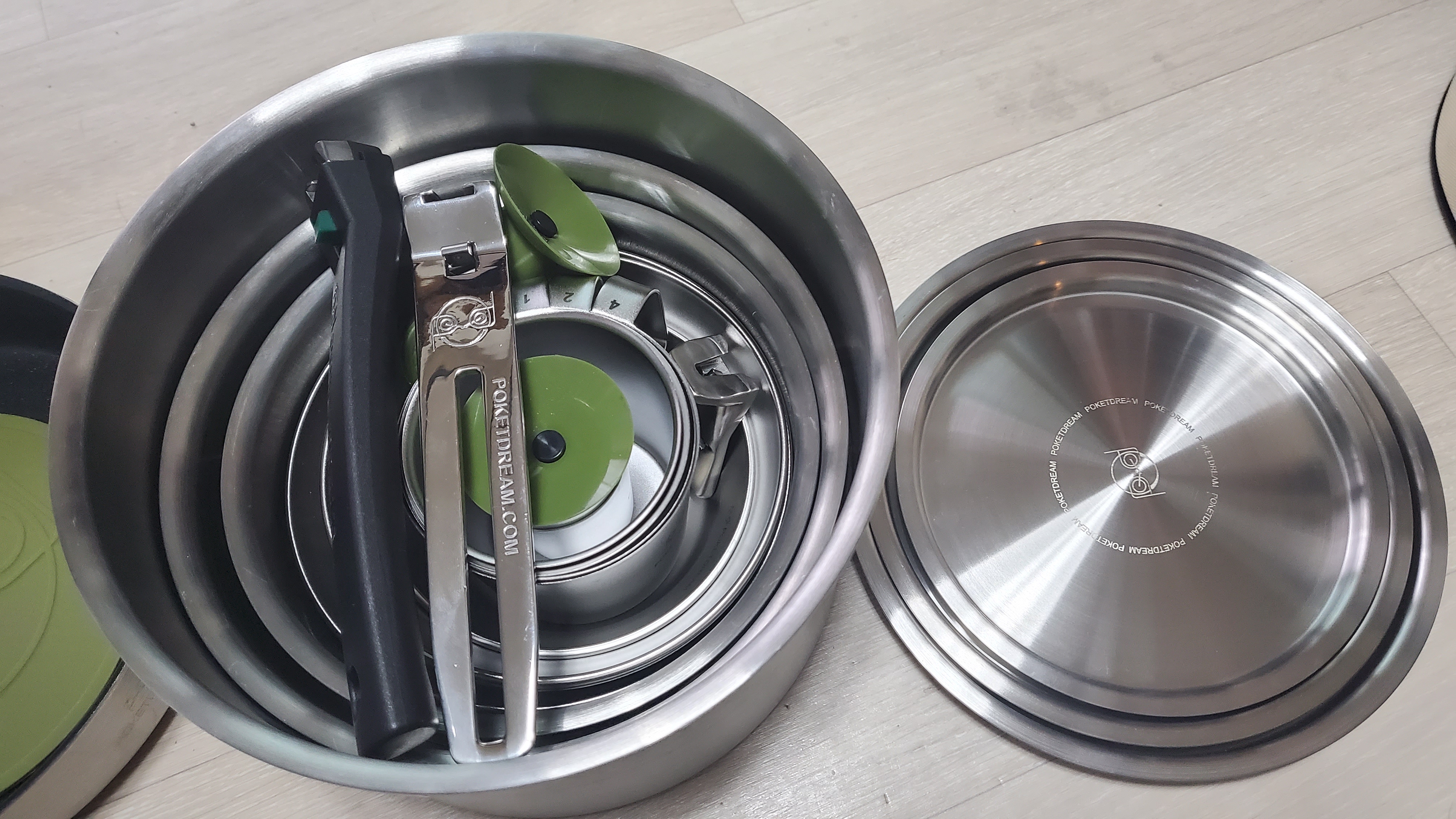 위에 뚜껑부분을 열면... 이렇게 수납이 된다. 문제는 냄비 안에꺼를 꺼내는게 편하지 않다... 거의 뒤집다시피 해야 안에 작은 냄비를 꺼낼 수가 있어서... 필요한 구성품만 꺼내 쓰기엔 조금 불편할 수도 있을 것 같다. 그래도 미니멀하게 모든걸 하나 안에 넣는다는게 장점인데 뭐 그정도 수고로움은 감당해야지 ㅎㅎ