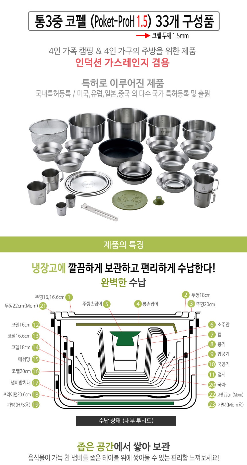 33개 세트는 4인 구성. 24개 세트는 3인, 21개 세트는 2인, 15개 세트는 종기 및 그릇류가 빠져있으며 11개 구성품은 딱 간편하게 코펠 위주로만 구성돼 있다. 가격이 부담된다면 필요한 구성 세트로 구매하거나, 좀더 저가형으로 나온 poket-ProS로 구매하는 방법도 있다.