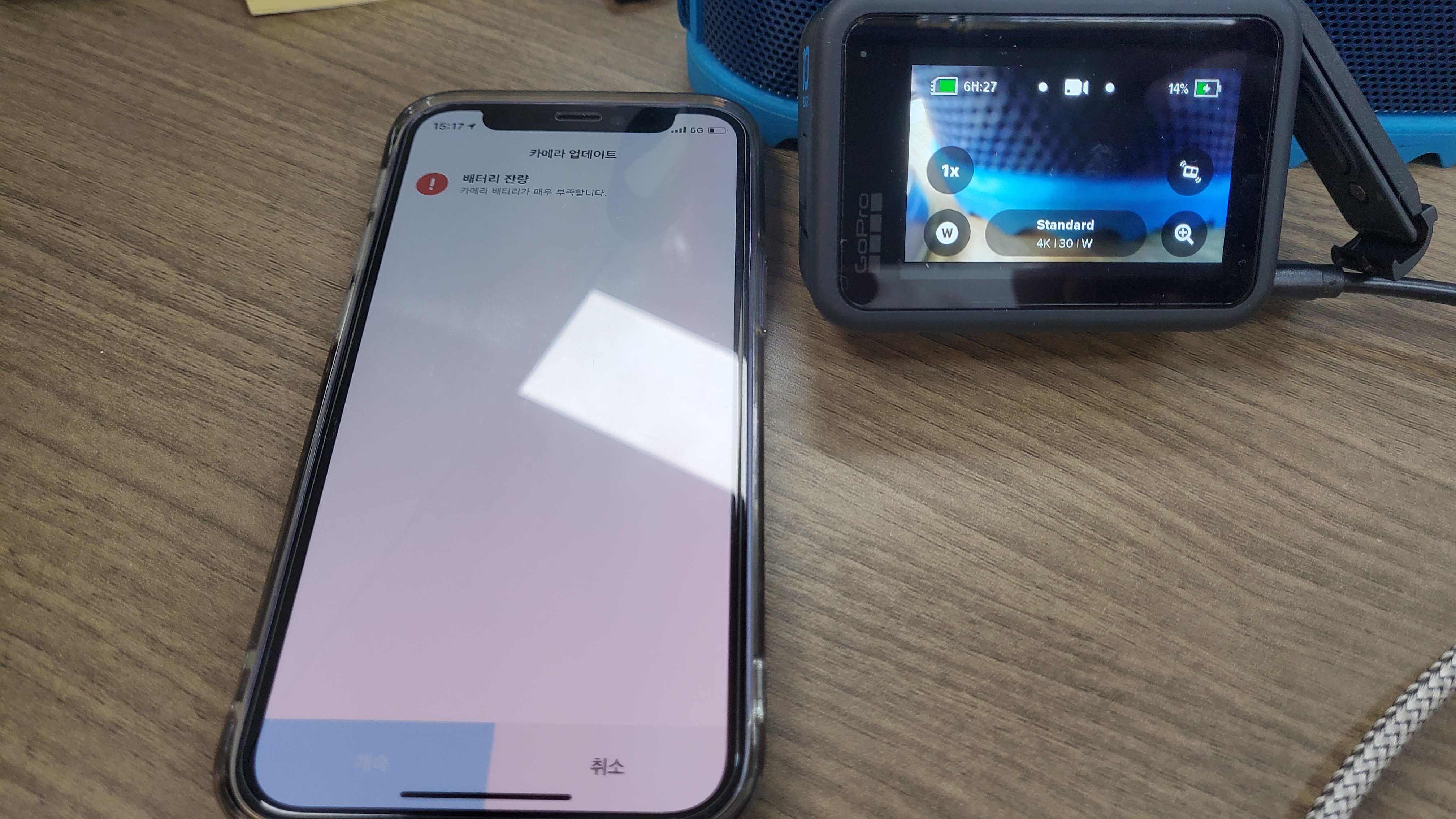 고프로를 처음 연결하니 업데이트를 하라고 나오는데, 배터리가 없댄다... 처음 구매하고 장착하니 하나는 14%, 다른건 27%다. 일단 14% 짜리를 껴두고... 충전을 위해 단자 연결. 그리고 20분 지나니