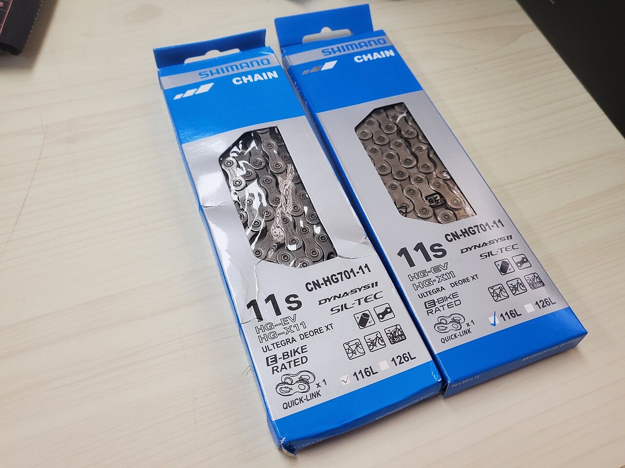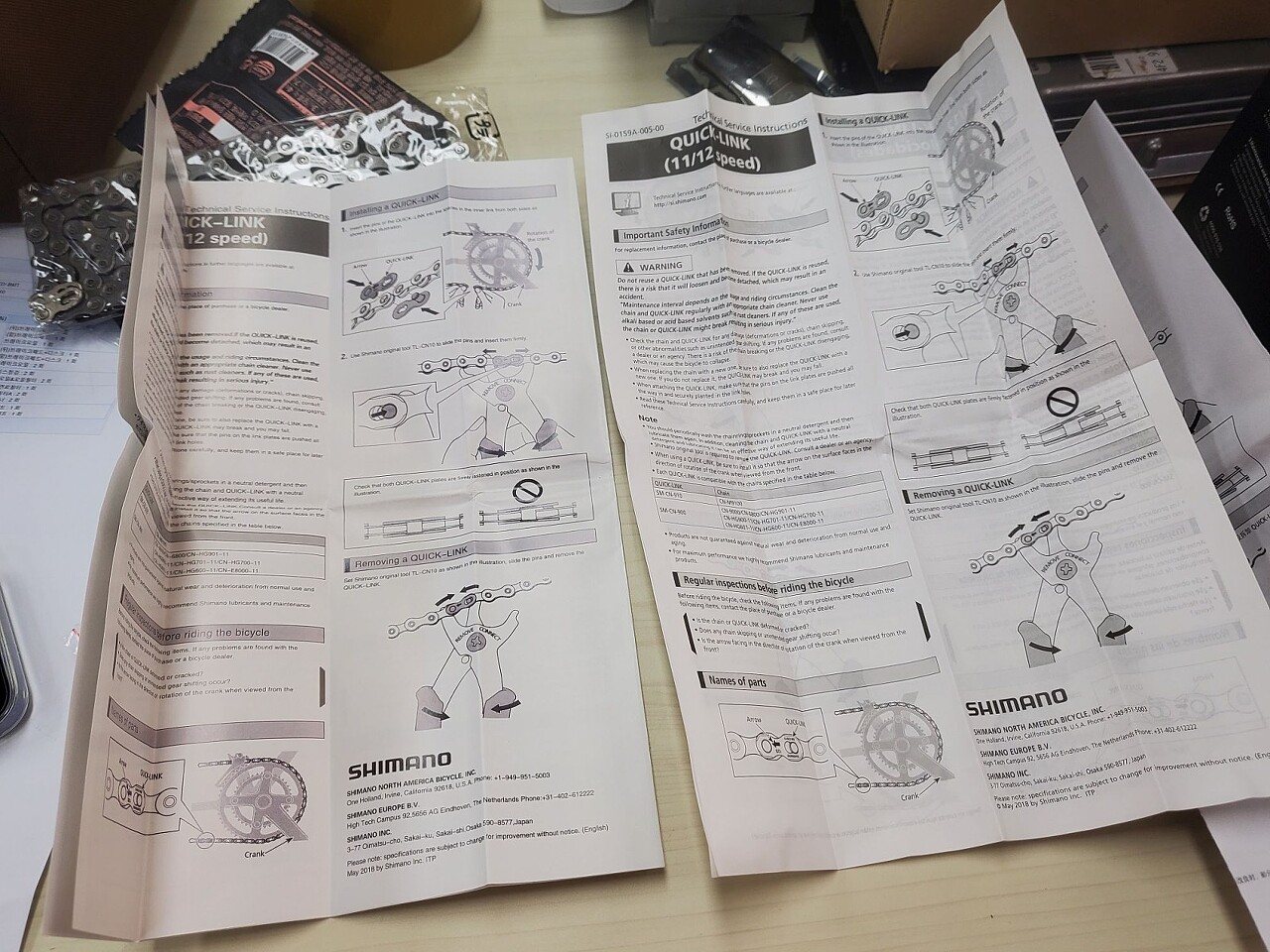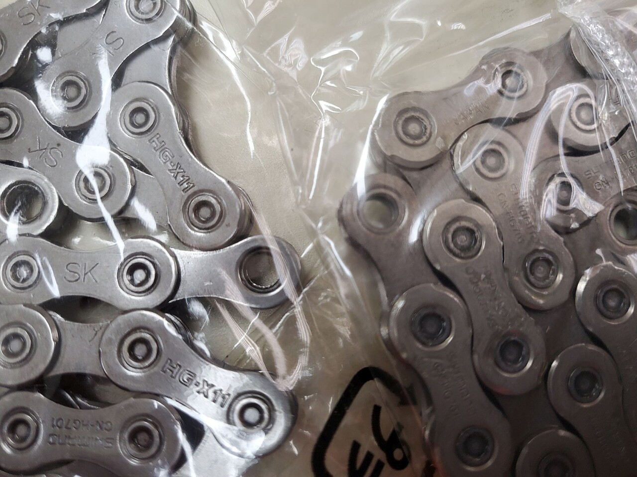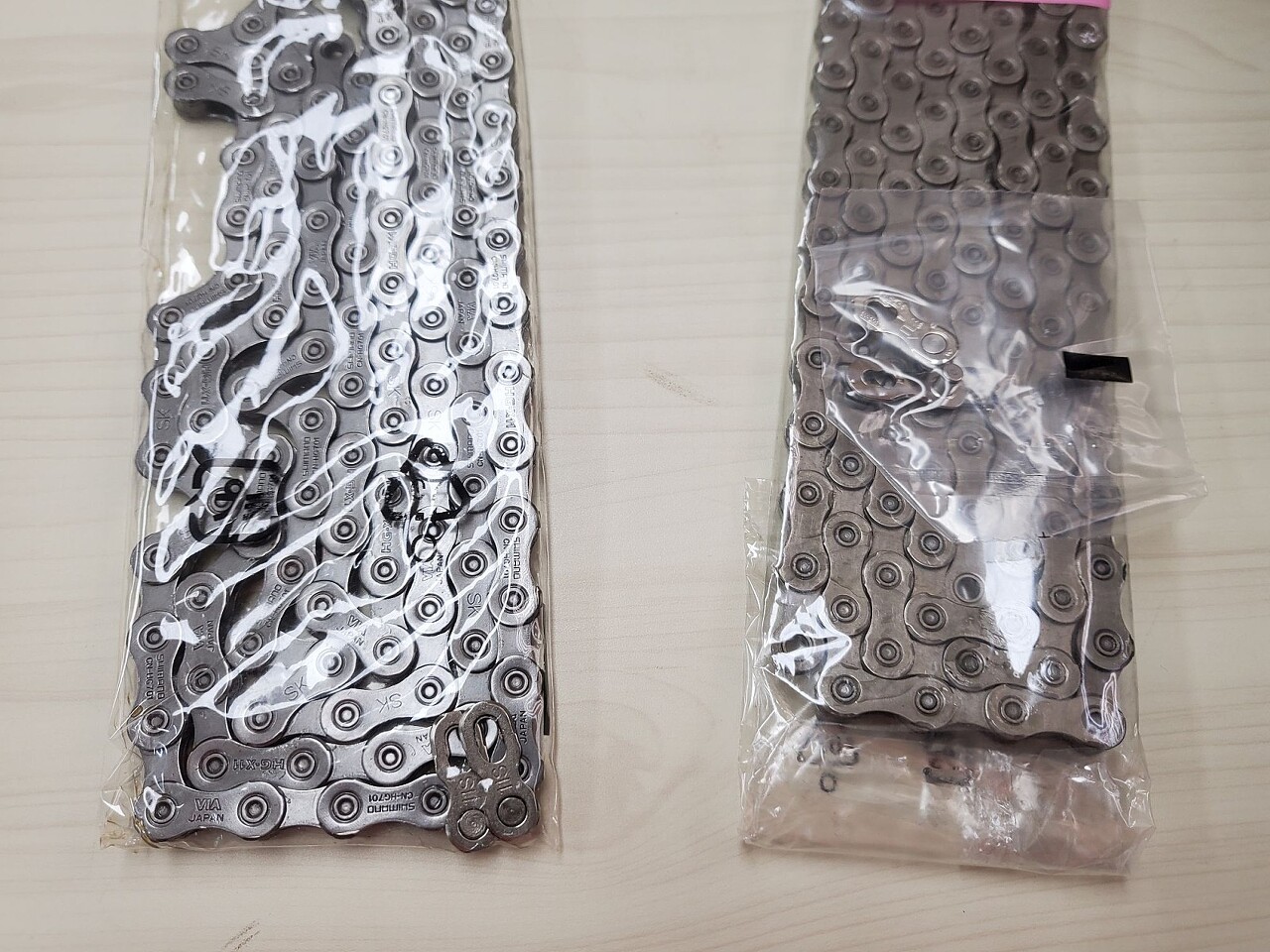 이제 제품 입니다. 사진 상으로 얼핏 보면 분간이 어려울 수 있으나, 좌측 알리발은 체인을 체결하는 면이 안으로 들어간 게 보입니다만, 정품은 그런게 없이 평평합니다. 또한 짭은 링크가 체인 내에 있으며, 정품은 링크가 별도 포장돼 있습니다. 체인 링크에 각인 상태만 봐도 뭔가 이상한게 바로 보입니다. 시마노 정품은 제품에 대해 디테일하게 적혀있는 반면, 카피는... 뭔가 허접한 링크가 들어있지요?