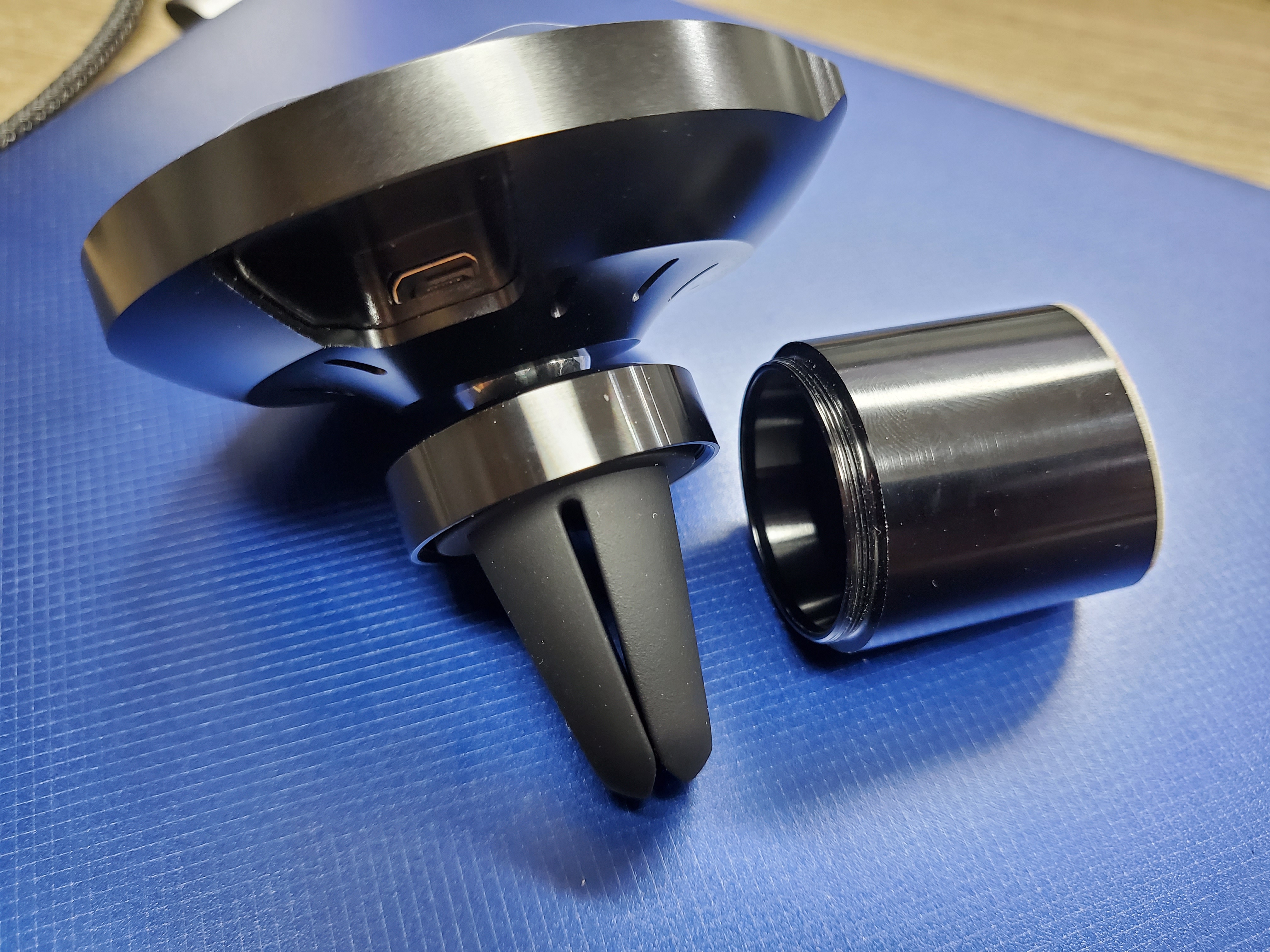 이 제품의 또 다른 특징이다. 제품은 크래들 형식으로 단순 접착 거치인 것으로 보이는데, 그 이외에 송풍구 거치도 가능한 타입이다. 바닥면 접착 거치대를 돌려서 풀면 이와 같이 분리되며 송풍구에 꽂을 수 있는 클립이 있다.