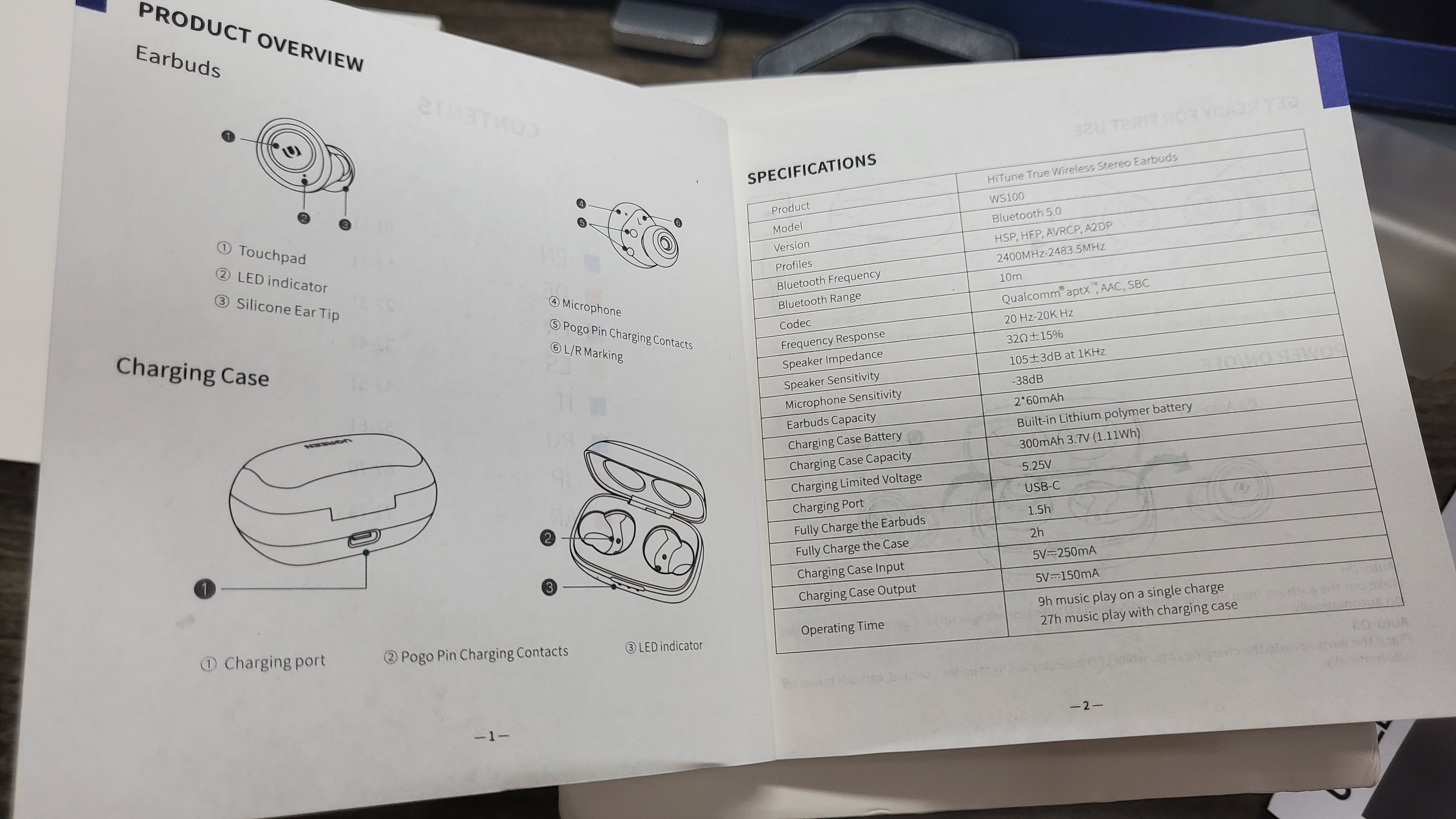 상단에 포함된 메뉴얼... 버튼 별 간단한 사용 방법, 그리고 제품 스펙시트가 포함돼 있다. 또 안에는 재생 시간이 9시간으로 표기... 뭐 대충 그럭저럭 오래 간다고 보라는 듯한?