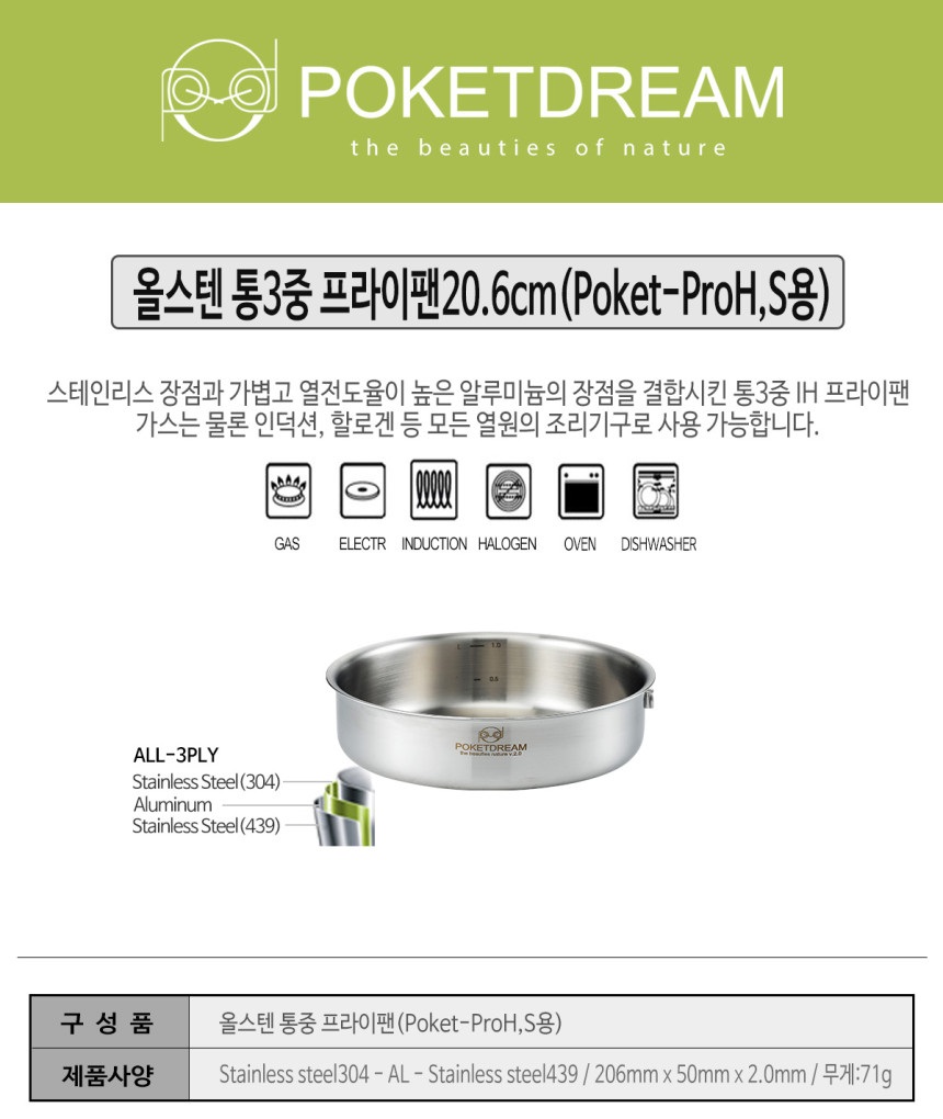 기본 냄비구성을 꺼내면 이렇게... 후라이팬에 냄비받침이 있다. 절대 저렇게 두어야 한다. 포켓드림 페이지를 보면