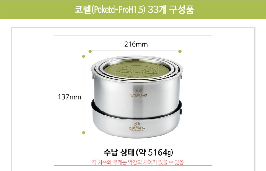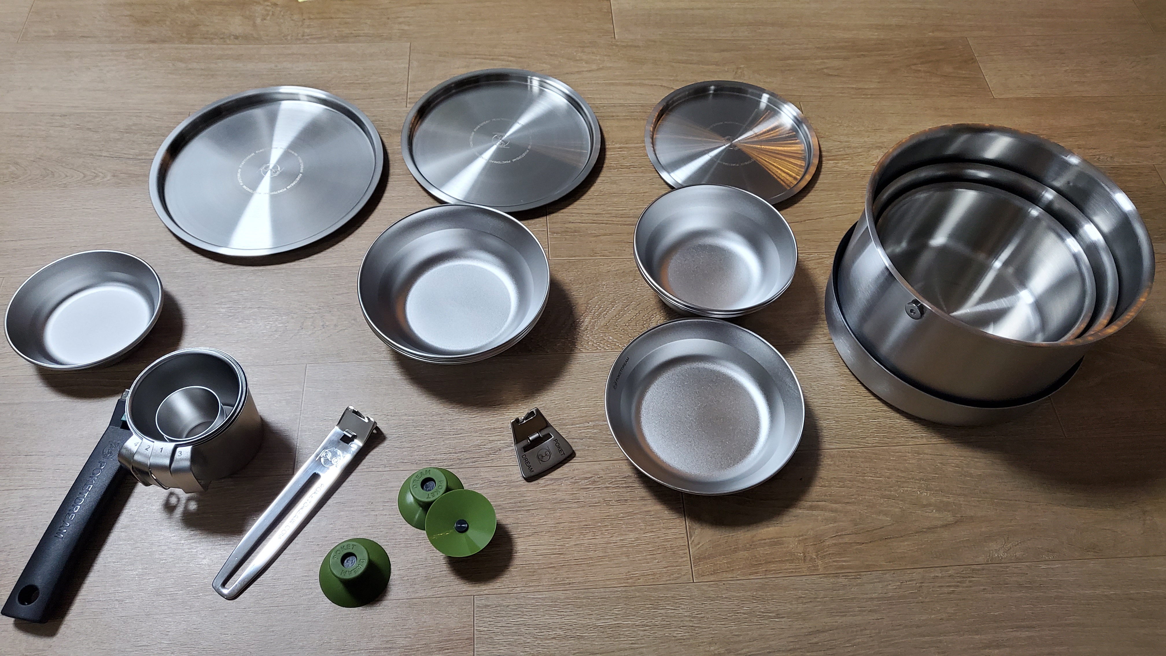 33개 세트는 4인 구성. 24개 세트는 3인, 21개 세트는 2인, 15개 세트는 종기 및 그릇류가 빠져있으며 11개 구성품은 딱 간편하게 코펠 위주로만 구성돼 있다. 가격이 부담된다면 필요한 구성 세트로 구매하거나, 좀더 저가형으로 나온 poket-ProS로 구매하는 방법도 있다.