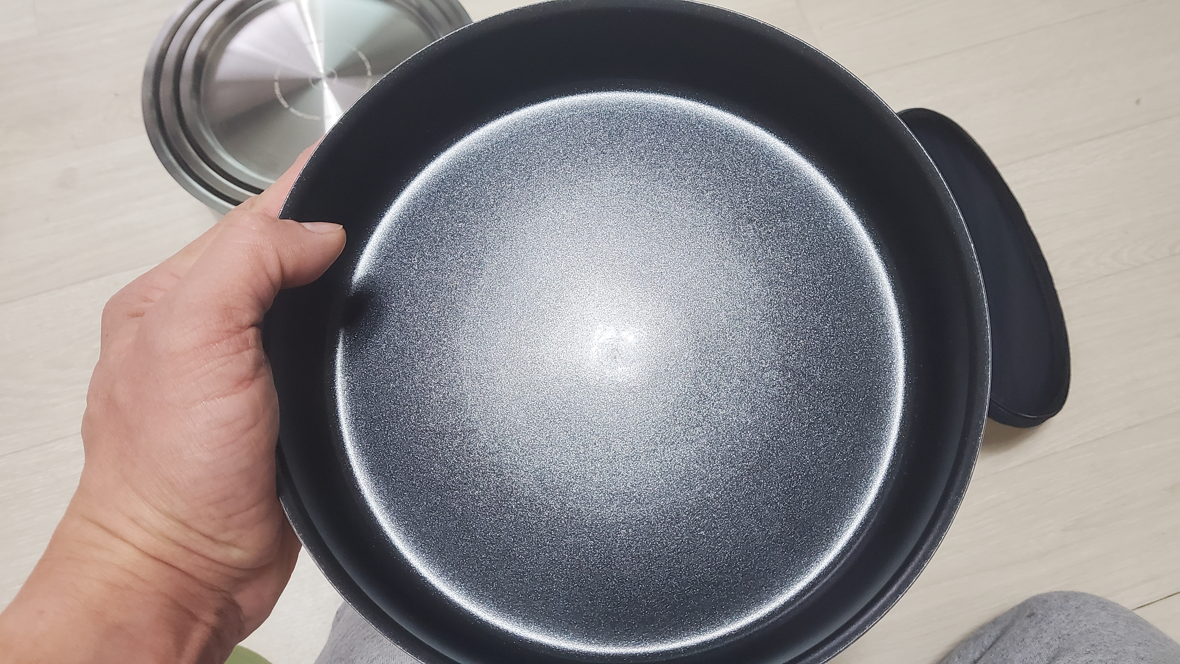 잘 안보이지만 미세하게... 코팅면에 흠집이 생겼다 ㅠㅠ 꼭 냄비받침은 완충 역할 겸 후라이팬 위에 두고 그 위에 냄비를 넣자. 구매 사이트를 보면