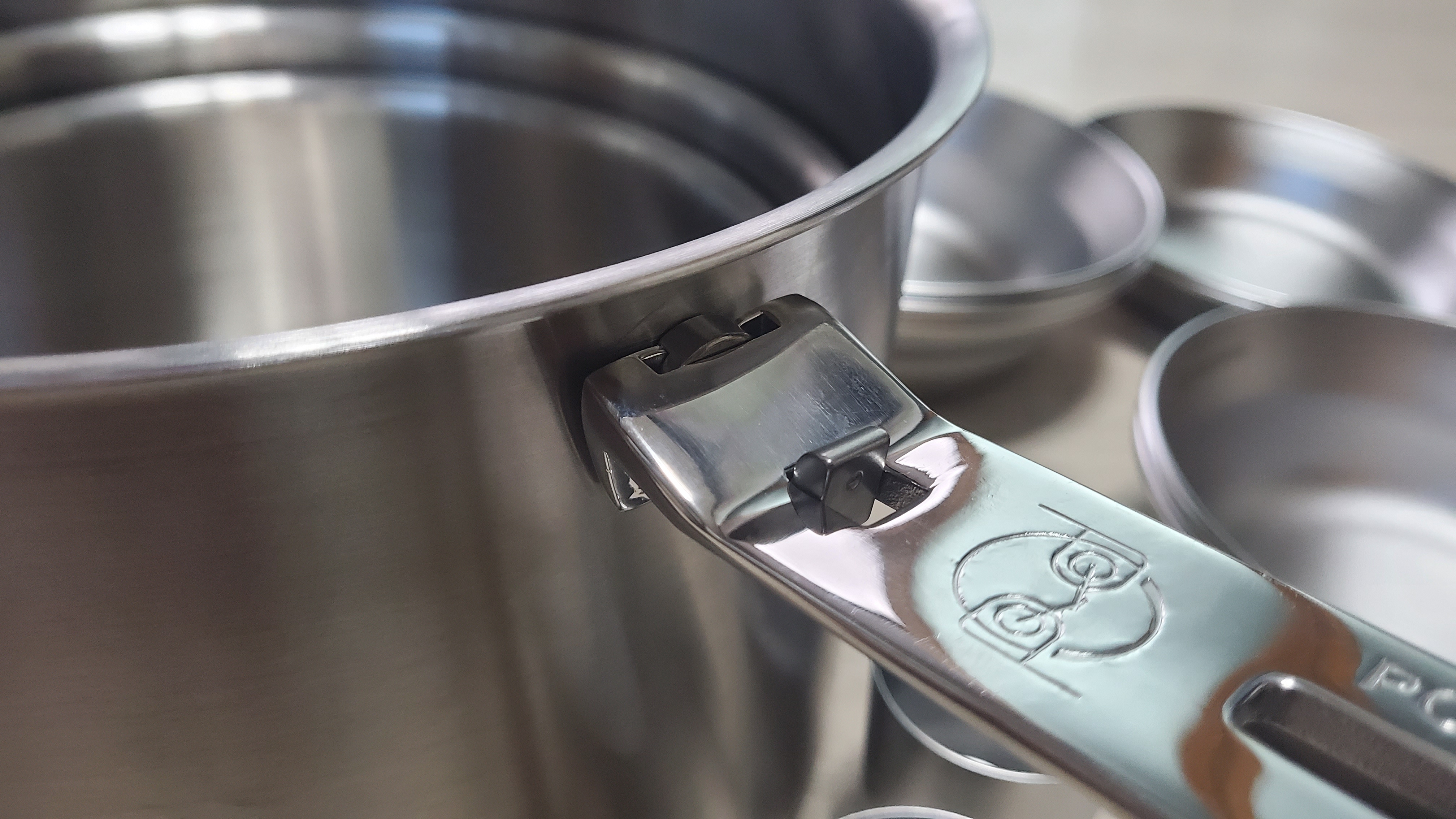 냄비에 부착하는 스테인리스 롱손잡이. 아래에서 위로 딸깍하면 끼워지고, 보이는 윗 부분을 당기면 빠진다.