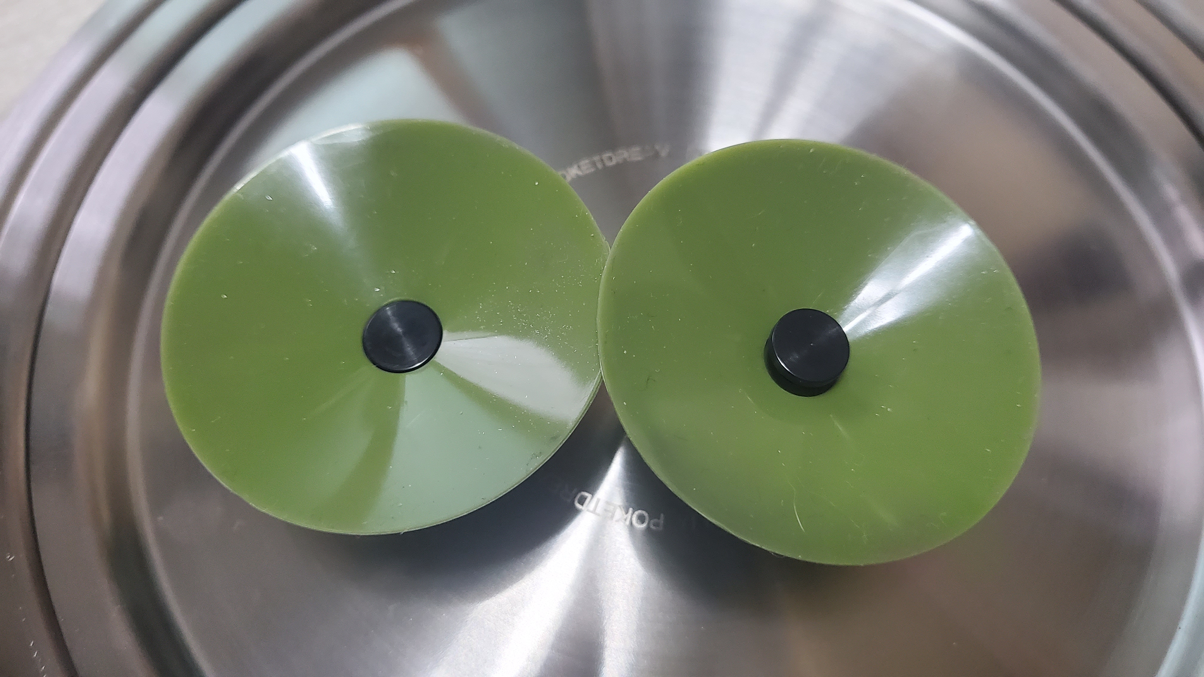 뚜껑 손잡이. 가운데 검은 부분을 왼쪽과 같이 밀어넣으면 뚜껑에 부착하여 손잡이로 쓸 수 있고, 탈거할 때에는 반대편에서 가운데 검은 부분을 밀면 공기가 들어가면서 분리가 된다. 그로 인해 뚜껑들에 손잡이 탈거가 되므로 수납이 훨씬 편해진다. 뿐만 아니라, 필요에 따라서는 저 뚜껑을 접시 대용으로도 사용 가능하니... 다목적!